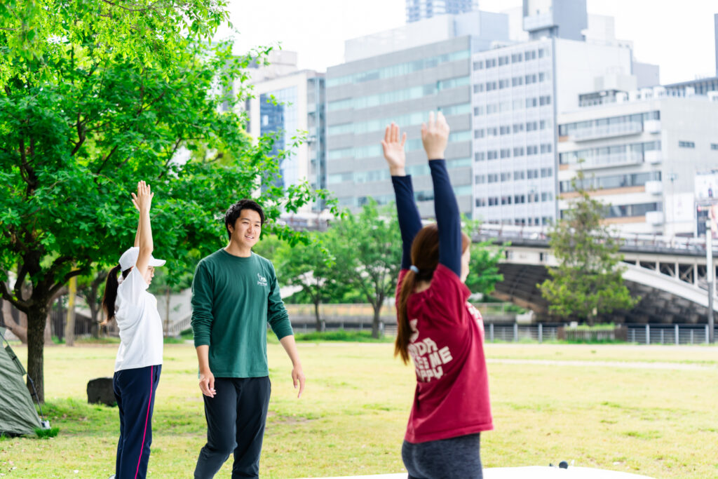 外の空気を感じながら、ご自身の呼吸の状態やカラダのバランスチェックなどを行います。
